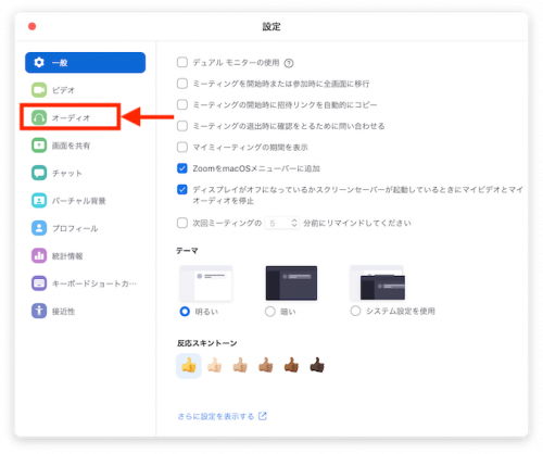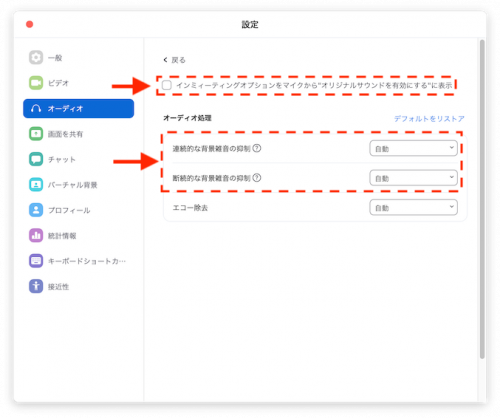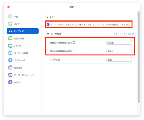 - インミーティングオプションをマイクから"オリジナルサウンドを有効にする"に表示 → オフ